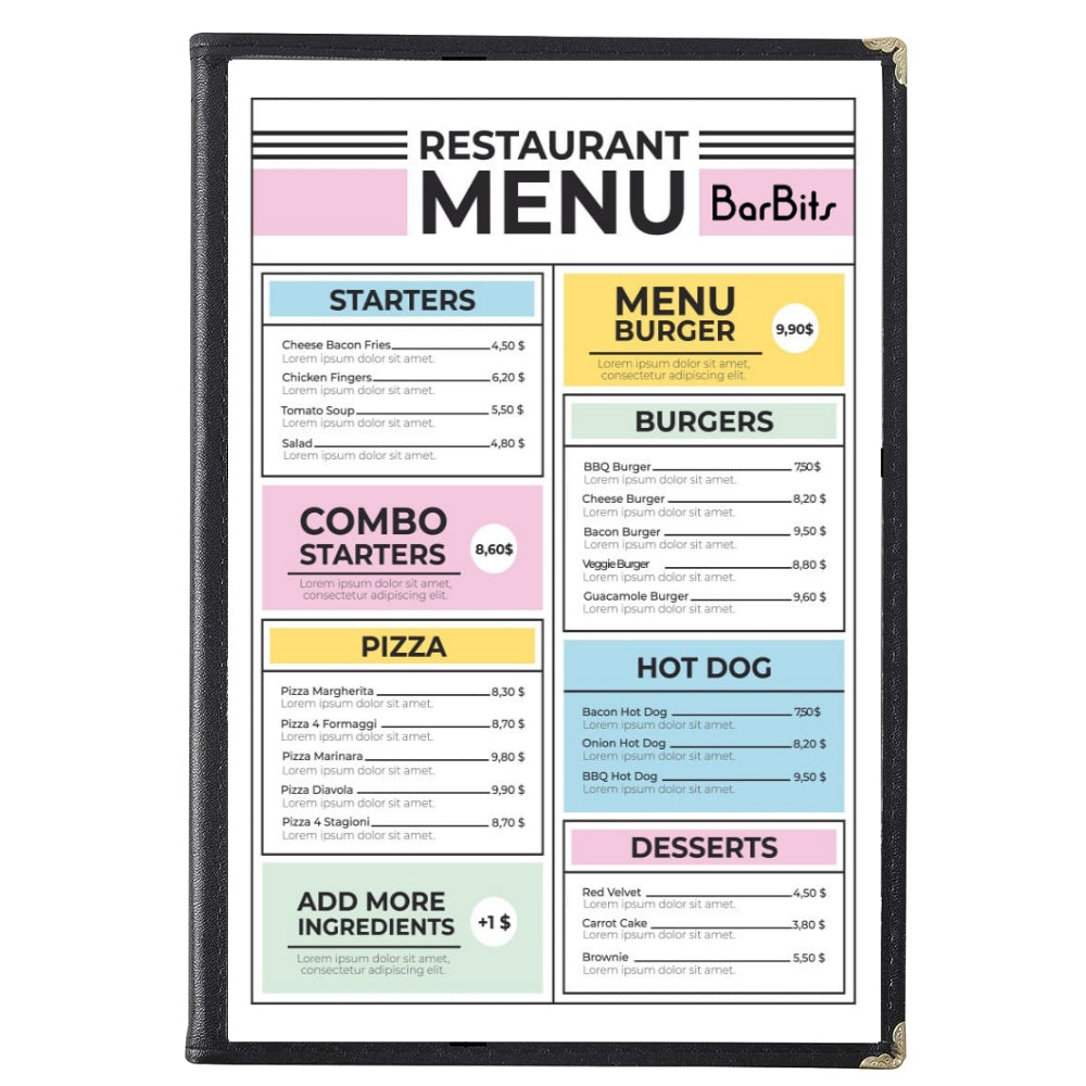 Elevate your establishment's aesthetic with our Double-Sided American Style Menu Cover, ideal for any environment including Gastro Pubs, Wine Bars, Cafes, Hotels, and Coffee Shops. This versatile menu cover is designed to save space while keeping your presentation tidy. Capable of showcasing an extensive menu, it allows diners to view a total of four pages, perfect for customizing the first and last sheets as a front and back cover.